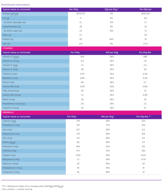 Isolated SOYA Protein, Partially Inverted Sugar Syrup, White Chocolate Flavour Topping (11%) (Sugar, Vegetable Oils (Palm Kernel, Palm), Whey Powder (MILK), WHEAT Flour (WHEAT Flour, Calcium Carbonate, Iron, Niacin, Thiamin), Emulsifier (SOYA Lecithin), Flavouring), OATSMargarine (Vegetable Oils (Sunflower, Rapeseed, Palm), Water, Salt, Emulsifiers (E471, Sunflower Lecithins), Preservative (E202), Acid (E270), Vitamins (Niacin, B6, Riboflavin, Folic Acid, B12), Flavourings, Colours (E160b, E100)), Chicory Fibre, Whey Protein Isolate (MILK), Humectant (E422), Vitamin and Mineral Preparation (Potassium Salts, Potassium Chloride, Calcium Carbonate, Magnesium Oxide, Salt, Vitamin C, Zinc Gluconate, Ferrous Fumarate, Vitamin K, Vitamin E, Niacin, Vitamin A, Pantothenic Acid, Manganese Gluconate, Cupric Gluconate, D-Biotin, Riboflavin, Vitamin D, Folic Acid, Vitamin B6, Thiamin, Chromium Picolinate, Vitamin B12, Potassium Iodide, Sodium Molybdate, Sodium Selenite), Pea Protein, Flavouring  Chocolate Flavour Coating (Sugar, Vegetable Oils (Palm Kernel, Palm), Whey Powder (MILK), Fat Reduced Cocoa Powder, WHEAT Flour (WHEAT Flour, Calcium Carbonate, Iron, Niacin, Thiamin), Emulsifiers (SOYA Lecithin, E476), Flavouring)),