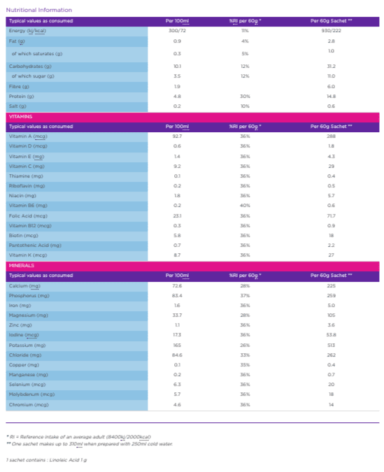 Maltodextrin, Skim Milk Powder, Milk Protein Concentrate, Soya Oil Powder [Soya Oil, Vegetable Fat, Whey Powder (Milk) , Milk protein, Soya Lecithin, Antioxidant (Ascorbyl Palmitate, Alpha Tocopherol), Stabiliser (Sodium Triphosphate), Anticaking Agent (Tricalcium Phosphate)], Fructose, Soya Protein Isolate, Dairy Creamer (Glucose Syrup, Coconut Oil, Caseinate (Milk), Dipotassium Phosphate, Soya Lecithin, Mono and Diglycerides of Fatty Acids), Thickeners (Guar Gum, Xanthan Gum), Tripotassium Citrate, Colour (Beetroot Red), Flavouring, Potassium Phosphate, Sodium Chloride, Trisodium Citrate, Magnesium Oxide, Sweetener (Sucralose), Vitamin C (Ascorbic Acid), Vitamin K (Menaquinone-7), Zinc Gluconate, Ferrous Fumarate, Vitamin E (dl-Alpha Tocopheryl Acetate), Manganese Gluconate, Niacin (Niacinamide), Vitamin A (Retinyl Acetate), Copper Gluconate, Pantothenic Acid (Calcium D-Pantothenate), D-Biotin, Folic Acid, Vitamin D (Cholecalciferol), Vitamin B6 (Pyridoxine Hydrochloride), Riboflavin (Riboflavin 5 Phosphate Sodium), Thiamin (Thiamin Hydrochloride), Chromium Polynicotinate, Vitamin B12 (Cyanocobalamin), Potassium Iodide, Sodium Molybdate, Sodium Selenite.