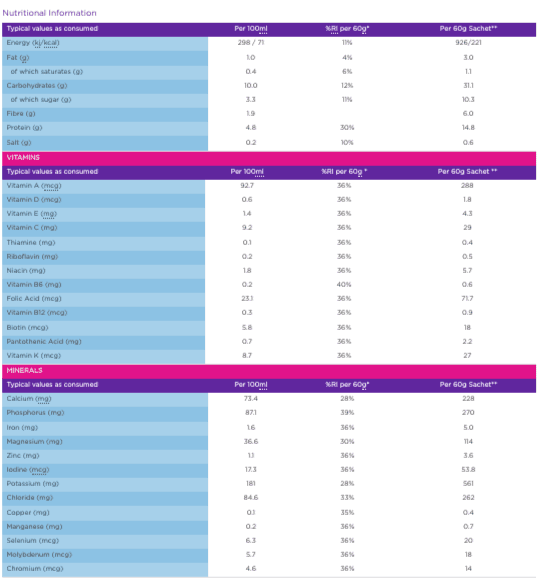Maltodextrin, Skim Milk Powder, Milk Protein Concentrate, Soya Oil Powder [Soya Oil, Vegetable Fat, Whey Powder (Milk) , Milk protein, Soya Lecithin, Antioxidant (Ascorbyl Palmitate, Alpha Tocopherol), Stabiliser (Sodium Triphosphate), Anticaking Agent (Tricalcium Phosphate)], Fructose, Soya Protein Isolate, Reduced Fat Cocoa Powder, Dairy Creamer (Glucose Syrup, Coconut Oil, Caseinate (Milk), Dipotassium Phosphate, Soya Lecithin, Mono and Diglycerides of Fatty Acids), Thickeners (Guar Gum, Xanthan Gum), Tripotassium Citrate, Flavouring, Potassium Phosphate, Sodium Chloride, Trisodium Citrate, Magnesium Oxide, Sweetener (Sucralose), Vitamin C (Ascorbic Acid), Vitamin K (Menaquinone-7), Zinc Gluconate, Ferrous Fumarate, Vitamin E (dl-Alpha Tocopheryl Acetate), Manganese Gluconate, Niacin (Niacinamide), Vitamin A (Retinyl Acetate), Copper Gluconate, Pantothenic Acid (Calcium D-Pantothenate), D-Biotin, Folic Acid, Vitamin D (Cholecalciferol), Vitamin B6 (Pyridoxine Hydrochloride), Riboflavin (Riboflavin 5 Phosphate Sodium), Thiamin (Thiamin Hydrochloride), Chromium Polynicotinate, Vitamin B12 (Cyanocobalamin), Potassium Iodide, Sodium Molybdate, Sodium Selenite.